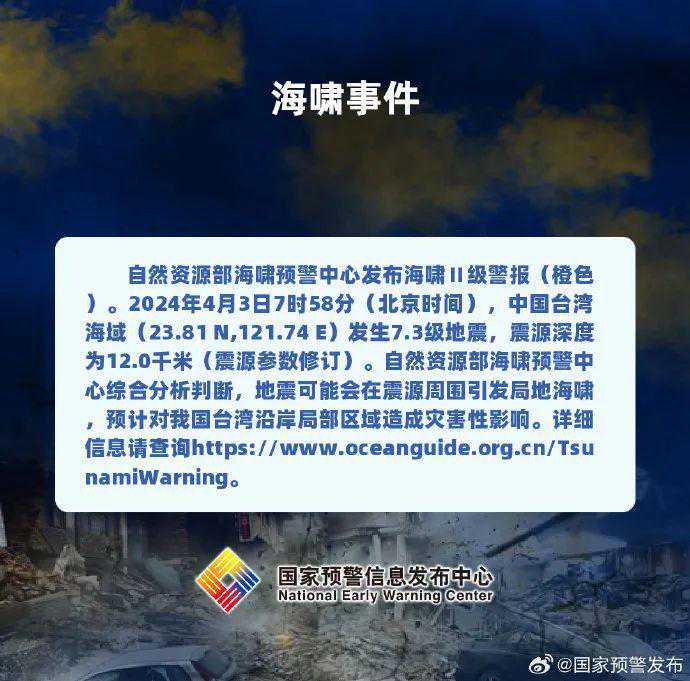 随后,自然资源部海啸预警中心再次发布海啸警报,为海啸Ⅱ级警报,也就是橙色警报。今天7时58分,中国台湾海域发生7.3级地震,震源深度为12千米。自然资源部海啸预警中心综合分析判断,地震可能会在震源周围引发局地海啸,预计对我国台湾沿岸局部区域造成灾害性影响。