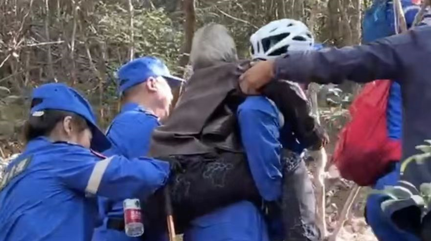 山上的队员背起老太艰难向下走