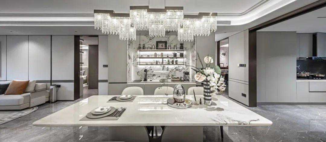 进入客厅,是开阔通透的餐客厨一体化的LDK空间,面积达到奢侈的近80㎡,地面的灰色奢石,客厅背景墙的定制岩板,以及墙面采用的BV风格编织皮革、米色壁布,精致金属边条,在隐形灯带的映衬下彰显隐奢风范。