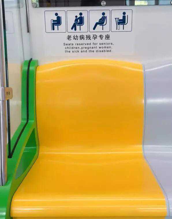 在座椅方面,与一、二号线最大不同就是将爱心座椅分散布局,采用“5+1”模式,将爱心座椅分散布置在成排座椅的一端,每个车厢设置四个。爱心座椅采用黄色,十分醒目。