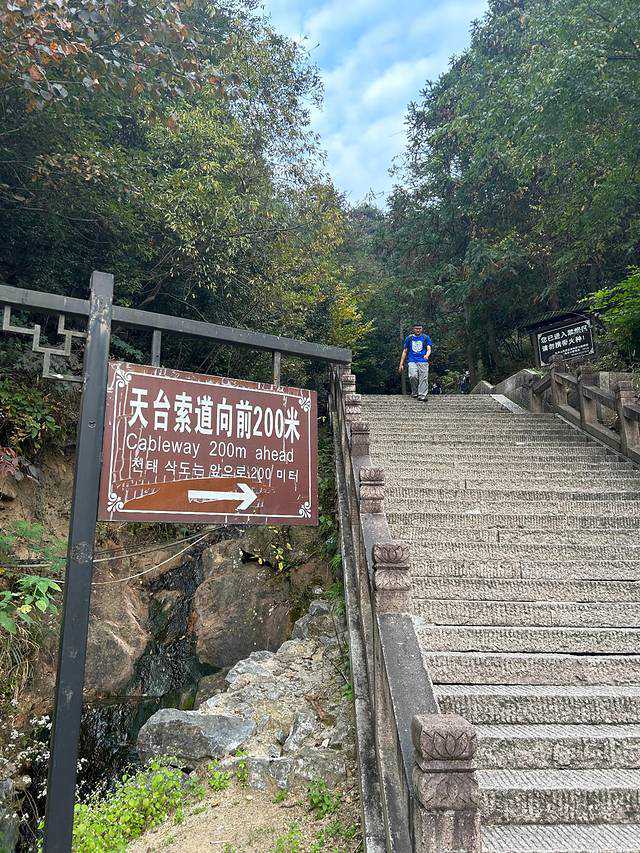 乘坐天台索道,全程10分钟左右,出站即是古拜经台。到了之后还需走1200多台阶才能到达山顶。