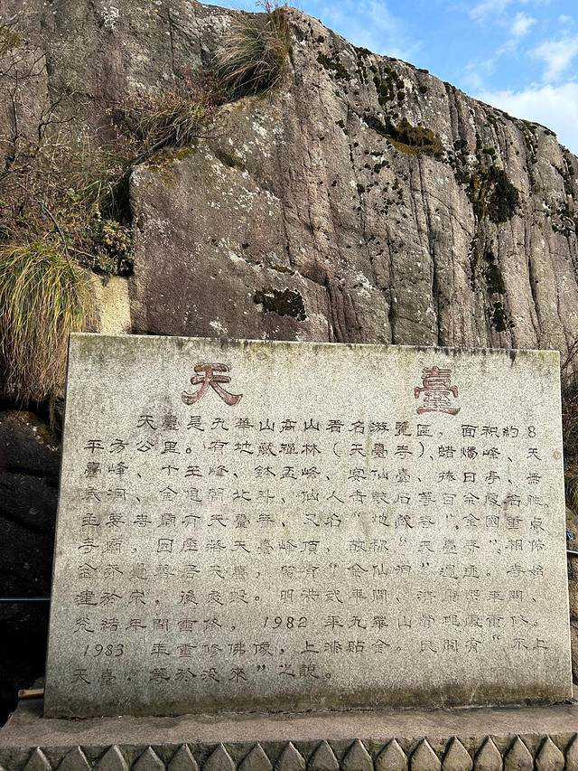 天台景区是九华山高山游览区,南至"道僧洞",西至闵园景区,北与花台景区相连,峰峦叠嶂,怪石嶙峋,面积约8平方公里。最高的十王峰位于该景区。
