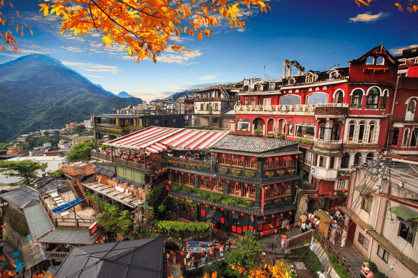 九份隶属新北市瑞芳区,相传在陆路尚未开通之时,一切物资供给仰赖海路进行,由于村落中只有九户人家,故对外采买时皆要求备妥「九份」,久而久之,人们便以此命名。九份之发展过程可谓一段先民采金史,随采金人潮的涌入而繁华,又随采金事业的没落而褪色。约略公元1890年左右,居民在福山宫土地祠距小金瓜不远处掘到金脉,这使得原本只有九户人家的贫穷村落,顿时聚集了三、四千户的淘金人口,此为九份的第一次繁华。