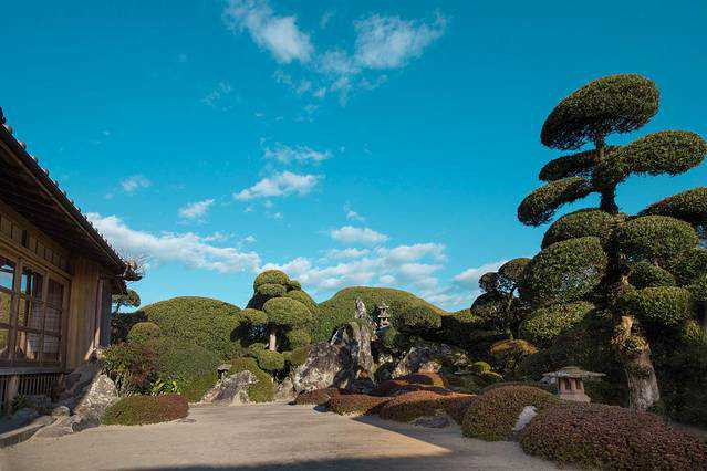 “森氏庭园”是可参观的7个庭院中唯一的一家有真实山水存在的筑山泉水式庭园。岩石巧妙的搭配出远近层次分明的山景和半岛,其他的6个庭园均采用枯山水式庭园设计,以白砂等来比喻“水池”,这也是知览庭园的特征之一。
