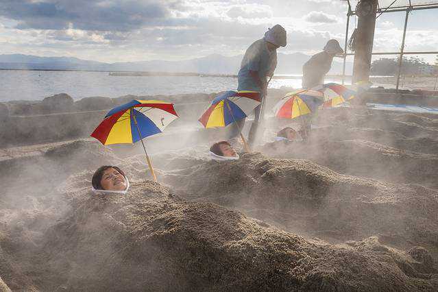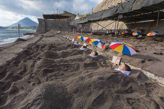 鹿儿岛南部有一个以砂浴闻名的地方,这种日式桑拿是利用海边涌出来的温泉遇上火山喷出的黑色砂石,于是在海岸线沙滩上形成了日本独一无二的的温泉砂浴,这个只有在指宿才能体验到哦。